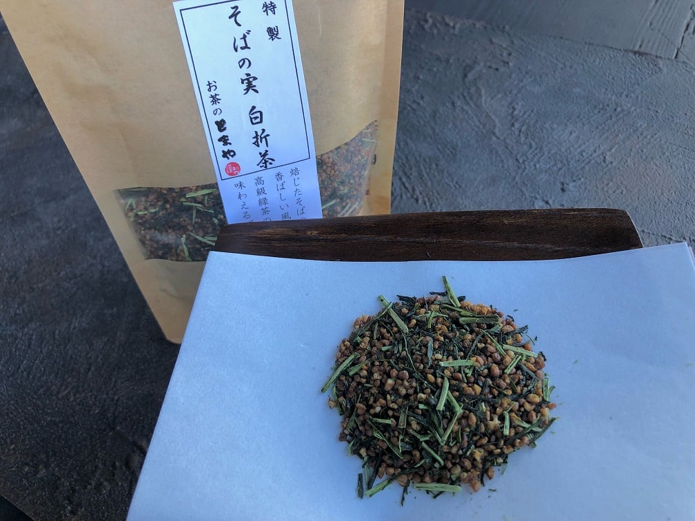 焙じたそばの実と高級白折茶をブレンドしました。芳ばしい香りと旨味を味わえます。100g